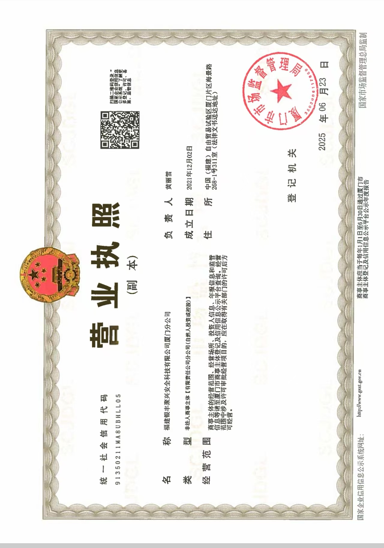 廈門分公司營業(yè)執(zhí)照